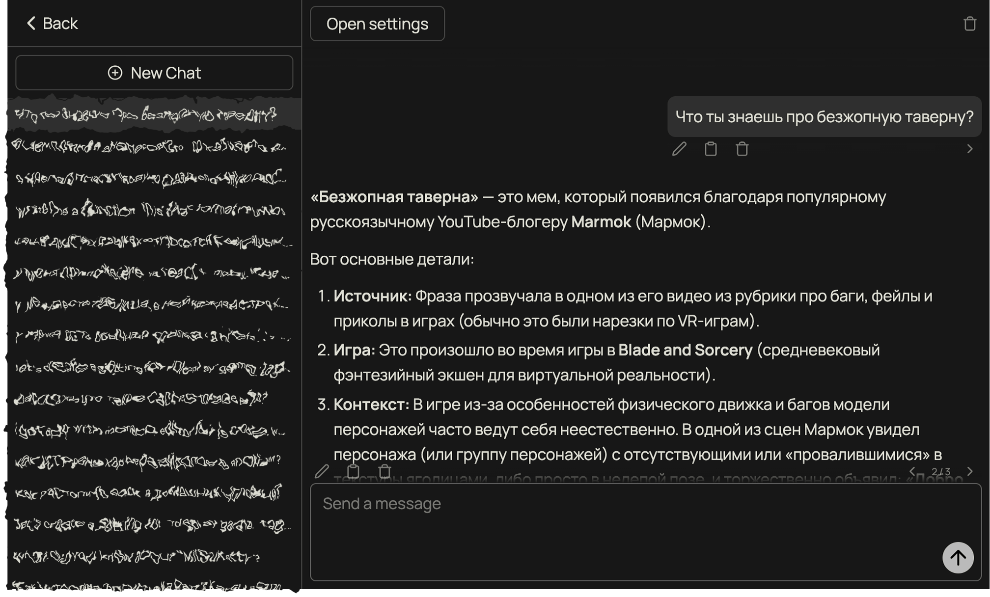 Отдельный режим, который позволяет делать запросы в режиме чата. Работает аналогично Open WebUI, LibreChat и прочим фронтендам. Особенности: