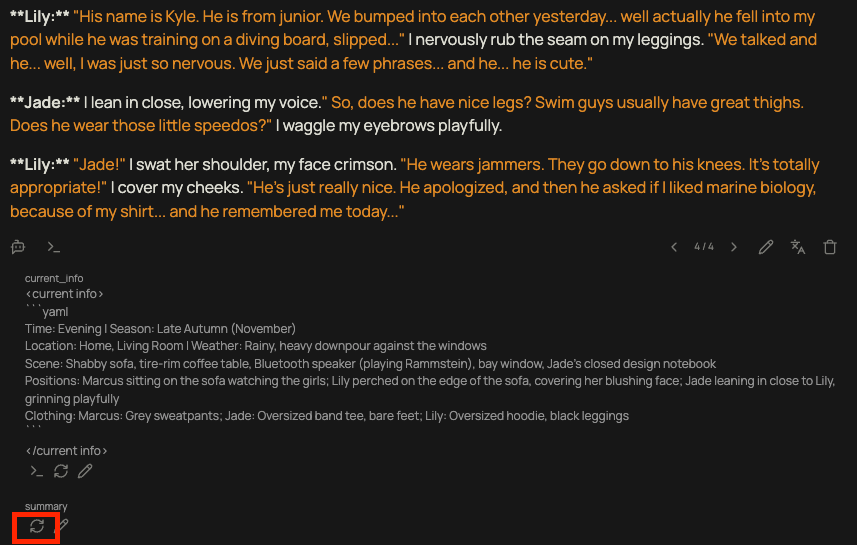 После того как он отработал, во всех последующих запросах история будет обрезаться до ближайшего сообщения с саммари через код-блок